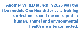 Another WiRED launch in 2025 was the five-module One Health Series, a training curriculum around the concept that human, animal and environmental health are interconnected. Climate change, population movement, food insecurity, zoonotic disease and environmental degradation have made integrated health strategies essential in understanding and treating the problem. Underserved communities are especially affected, yet they often lack access to education that explains these risks. WiRED’s comprehensive One Health training program prepares CHWs for climate change and environmental challenges through closer scrutiny of community health threats. The program stresses the need for CHWs to provide information about rising health risks to officials and higher-level medical authorities.