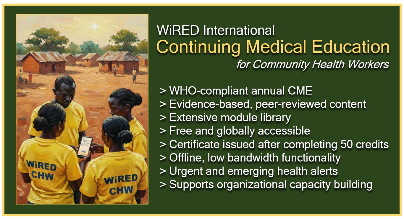 WiRED International, providing healthcare training in low-resource countries for 30-years, offers not only Basic and Advanced CHW Training, but also a Continuing Medical Education (CME) Program to ensure that CHWs everywhere have the knowledge, skills and confidence they need to protect their communities. This is especially critical now that severe budget cuts have brought about the most challenging health conditions in low-resource countries.