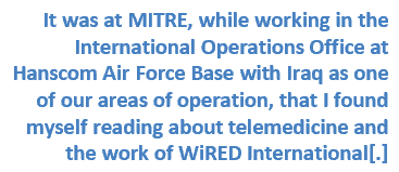 From the age of 16 years and two days until just before I turned 30, I held a variety of paid and volunteer healthcare roles — from respiratory therapist to EMT to EKG analyst — providing me an introduction not only to the science of medicine but to the heart of humanity, where again you are part of a community that gives of themselves to care for others. Eventually, my mathematics degree and a growing fascination with how systems break led me away from the bedside and into cybersecurity and defense — first at BBN and Partners Healthcare, then at the MITRE Corporation, where I joined to work on science in the public interest. My field became cyber security and cyber defense, though it has always carried a heavy intersection with international relations — understanding how nations protect critical infrastructure, how they cooperate, and how they fail to. It was at MITRE, while working in the International Operations Office at Hanscom Air Force Base with Iraq as one of our areas of operation, that I found myself reading about telemedicine and the work of WiRED International — how they had established Community Healthcare Information Centers in the five major medical centers throughout Iraq and were expanding into community hospitals. Gary was kind enough to allow me to work with him on a plan for the Iraqi Telemedicine Network, which would expand WiRED’s footprint across the country and provide access to expert clinical consultations through technology that we were building and deploying at the time.