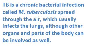 TB is a chronic bacterial infection called M. tuberculosis spread through the air, which usually infects the lungs, although other organs and parts of the body can be involved as well.