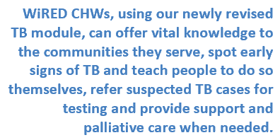 WiRED CHWs, using our newly revised TB module, can offer vital knowledge to the communities they serve, spot early signs of TB and teach people to do so themselves, refer suspected TB cases for testing and provide support and palliative care when needed.