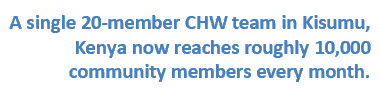 The data from the field is impressive. A single 20-member CHW team in Kisumu, Kenya now reaches roughly 10,000 community members every month. The statistics reveal the outreach effectiveness of clinical services and disease prevention programs in schools, health screening clinics and other public forums. We met with these seasoned CHWs to listen to their experiences and to learn about their strategies for advancing community health in a time of unprecedented resource scarcity.