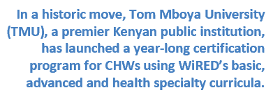 1. In a historic move, Tom Mboya University (TMU), a premier Kenyan public institution, has launched a year-long certification program for CHWs using WiRED’s basic, advanced and health specialty curricula. This is a first for Kenya: a rigorous, high-level academic track covering a professional-level CHW training program. By adopting WiRED’s curriculum, TMU is fortifying the health ramp or bridge concept advocated by the World Health Organization. Graduates will become the critical health workers on the ground who know and train the community and clear the way for people to obtain higher-level care through seamless connections to the official health system.