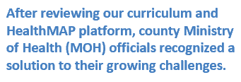 2. Presentations of our training programs resonated deeply with local leadership. After reviewing our curriculum and HealthMAP platform, county Ministry of Health (MOH) officials recognized a solution to their growing challenges. One county has already signed a Memorandum of Understanding with WiRED to launch a “Train-the-Trainer” and “Train the Supervisor” programs, which we are prepared to do so immediately.  Three additional counties are currently reviewing the results for adoption.
