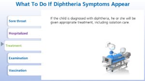 This diphtheria module describes diphtheria, discusses diagnosis and treatment, and it teaches how people can protect themselves. For instance, they should cover coughs and sneezes because the bacteria travel through air droplets. Since the bacteria also spread through direct physical contact, people should avoid touching secretions of infected people and objects they handle. People should maintain good personal hygiene and avoid crowds. The module also cautions people who travel, noting that they will be at increased risk if they venture into infected areas.