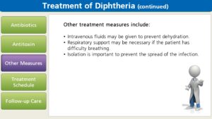 This diphtheria module describes diphtheria, discusses diagnosis and treatment, and it teaches how people can protect themselves. For instance, they should cover coughs and sneezes because the bacteria travel through air droplets. Since the bacteria also spread through direct physical contact, people should avoid touching secretions of infected people and objects they handle. People should maintain good personal hygiene and avoid crowds. The module also cautions people who travel, noting that they will be at increased risk if they venture into infected areas.