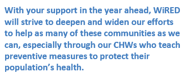 May you and your loved ones have a safe and enjoyable holiday season! While we celebrate the work we have accomplished together in 2025, we all might keep in mind the many underserved populations that face disease and starvation every day in a world of increasing uncertainty from climate change, food insecurity and conflict — and now the prospect of facing this world without vaccines and medicine. With your support in the year ahead, WiRED will strive to deepen and widen our efforts to help as many of these communities as we can, especially through our CHWs who teach preventive measures to protect their population’s health.