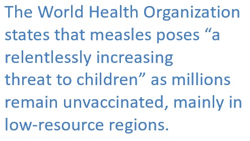 Populations most at risk for measles complications and death are young children and pregnant women. The World Health Organization states that measles poses “a relentlessly increasing threat to children” as millions remain unvaccinated, mainly in low-resource regions.