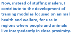 When I was invited to return to WiRED as a board member, it felt like a full-circle moment. I’m honored to support the organization’s educational initiatives that provide accessible, accurate health information to underserved communities. Now, instead of stuffing mailers, I contribute to the development of training modules focused on animal health and welfare, for use in regions where people and animals live interpedently in close proximity.