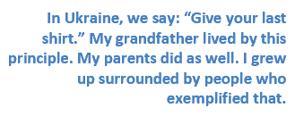 In Ukraine, we say: “Give your last shirt.” My grandfather lived by this principle. My parents did as well. I grew up surrounded by people who exemplified that.