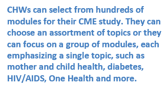 Consequently, WiRED’s CME program requires each member of its CHW team to earn 50 CME credits each year. CHWs can select from hundreds of modules for their CME study. They can choose an assortment of topics or they can focus on a group of modules, each emphasizing a single topic, such as mother and child health, diabetes, HIV/AIDS, One Health and more.